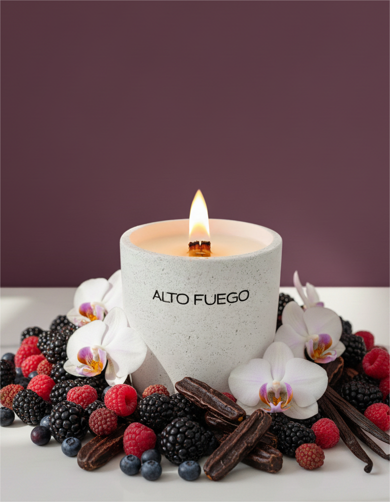 Sumérgete en la calidez de un atardecer en penumbra, donde las orquídeas y las frutas oscuras se entrelazan en un abrazo sensual y vibrante.
