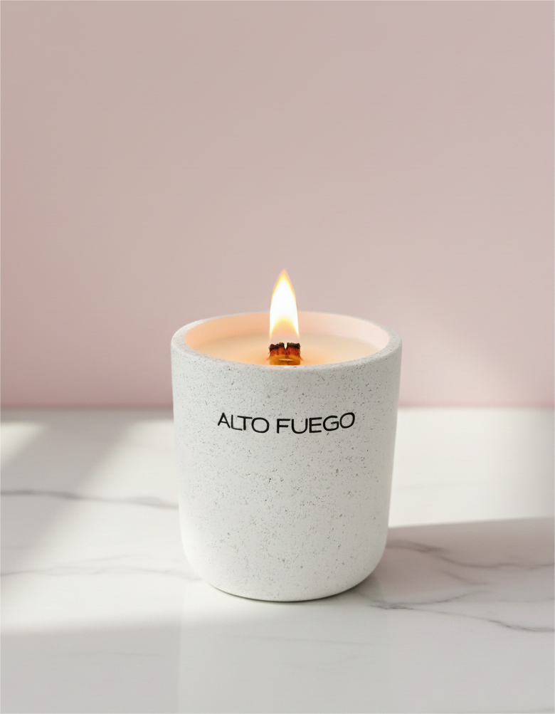 Nuestra mezcla de ceras naturales, fragancias hechas con aceites esenciales y libres de toxinas, pabilos de madera.